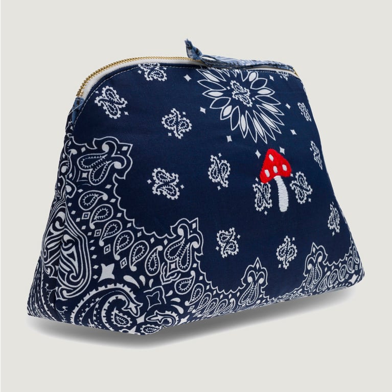 バンダナ生地にワンポイントの刺繍がかわいいジップポーチ