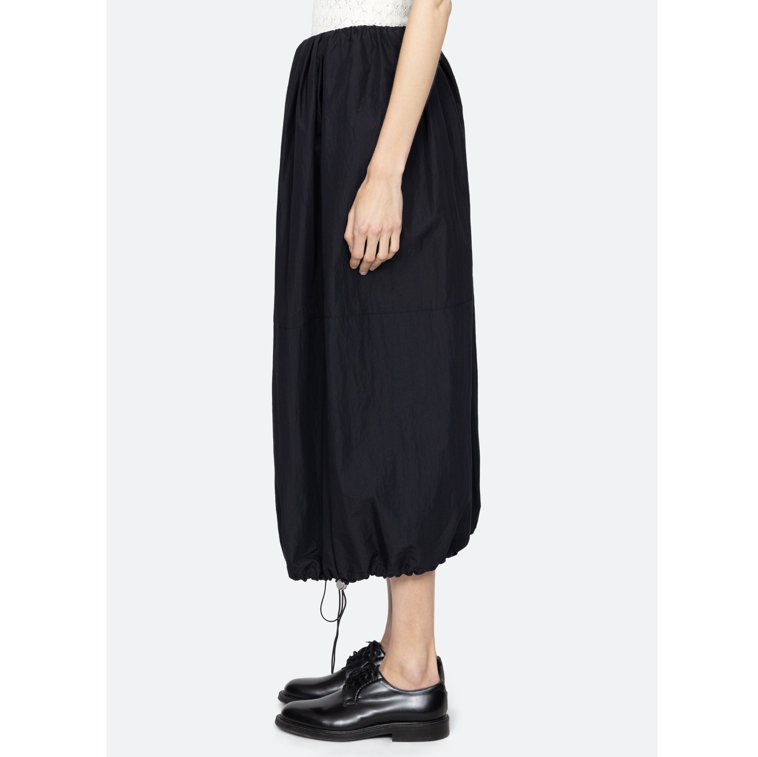 裾を紐で絞りデザインを調節できるBUBBLEスカート