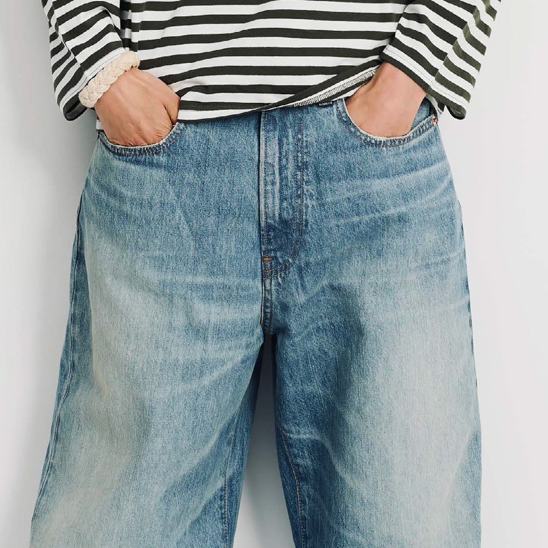 Denimistのデニムは手作業でディストレス加工を施し、クラシックで現代的なシェイプにカットされています。