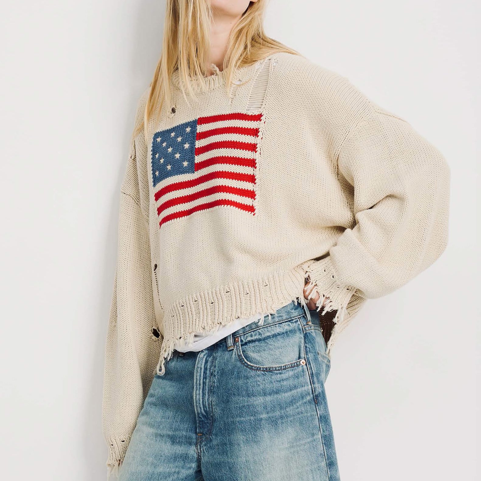 DENIMIST OVERSIZED CROPPED AMERICAN FLAG SWEATER OATMEAL