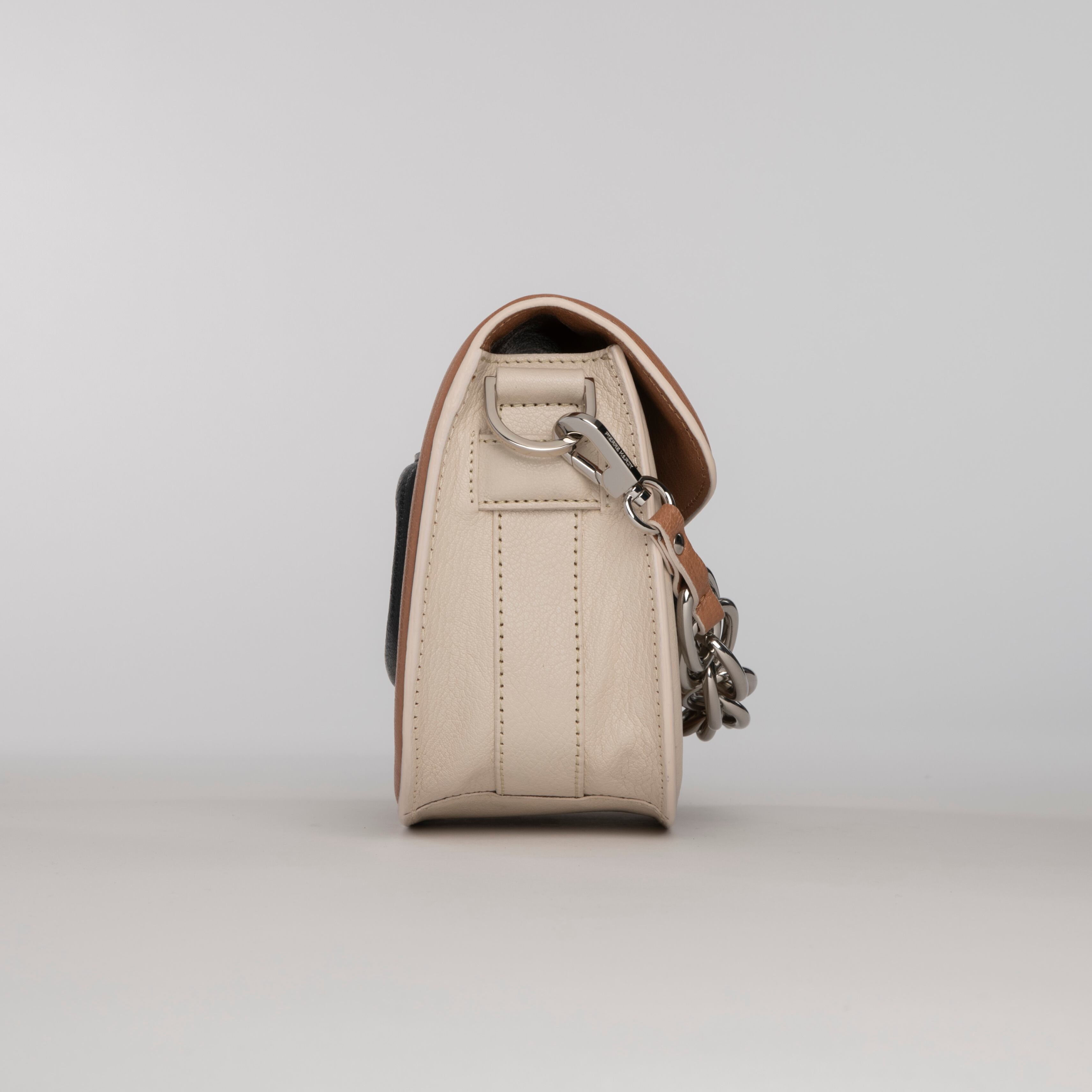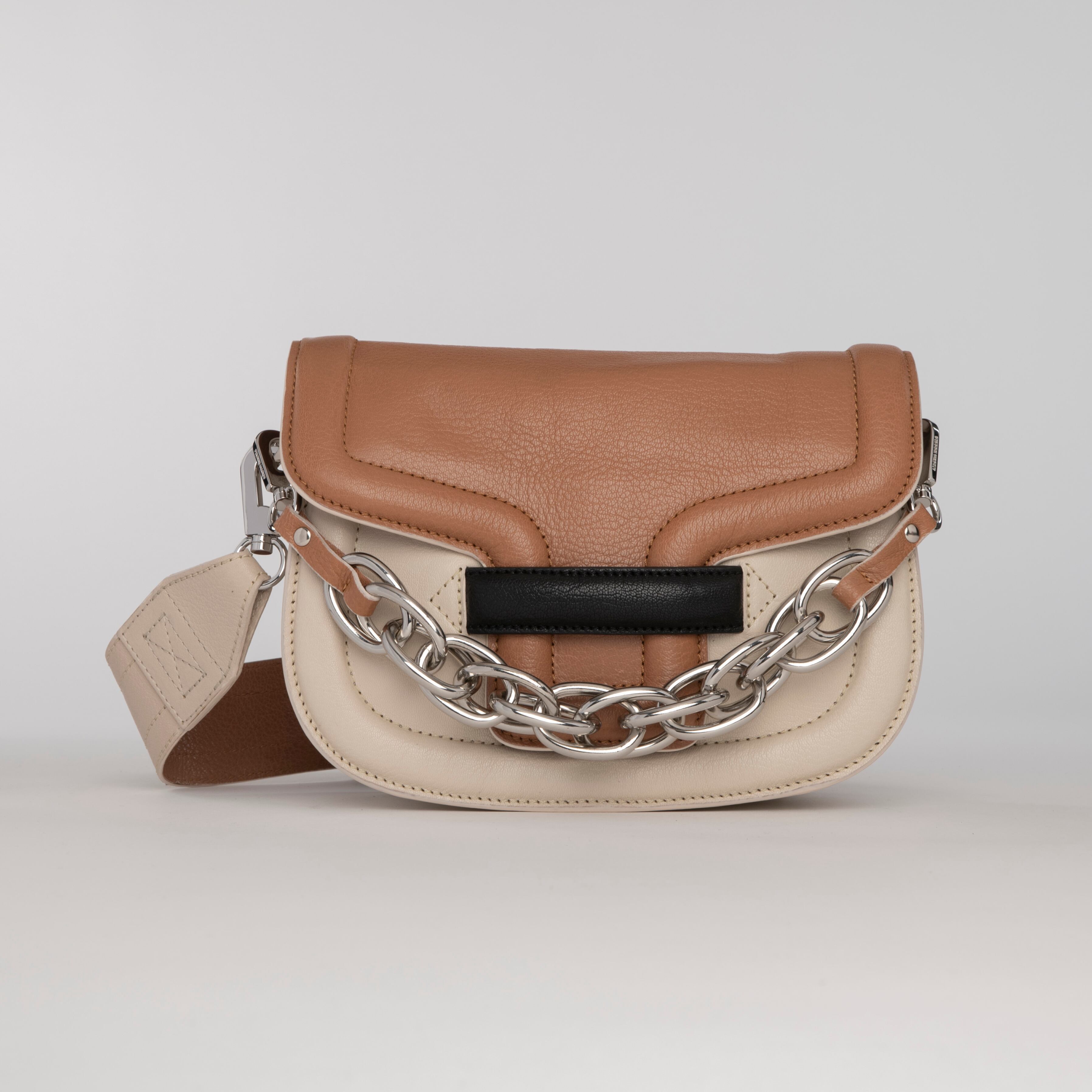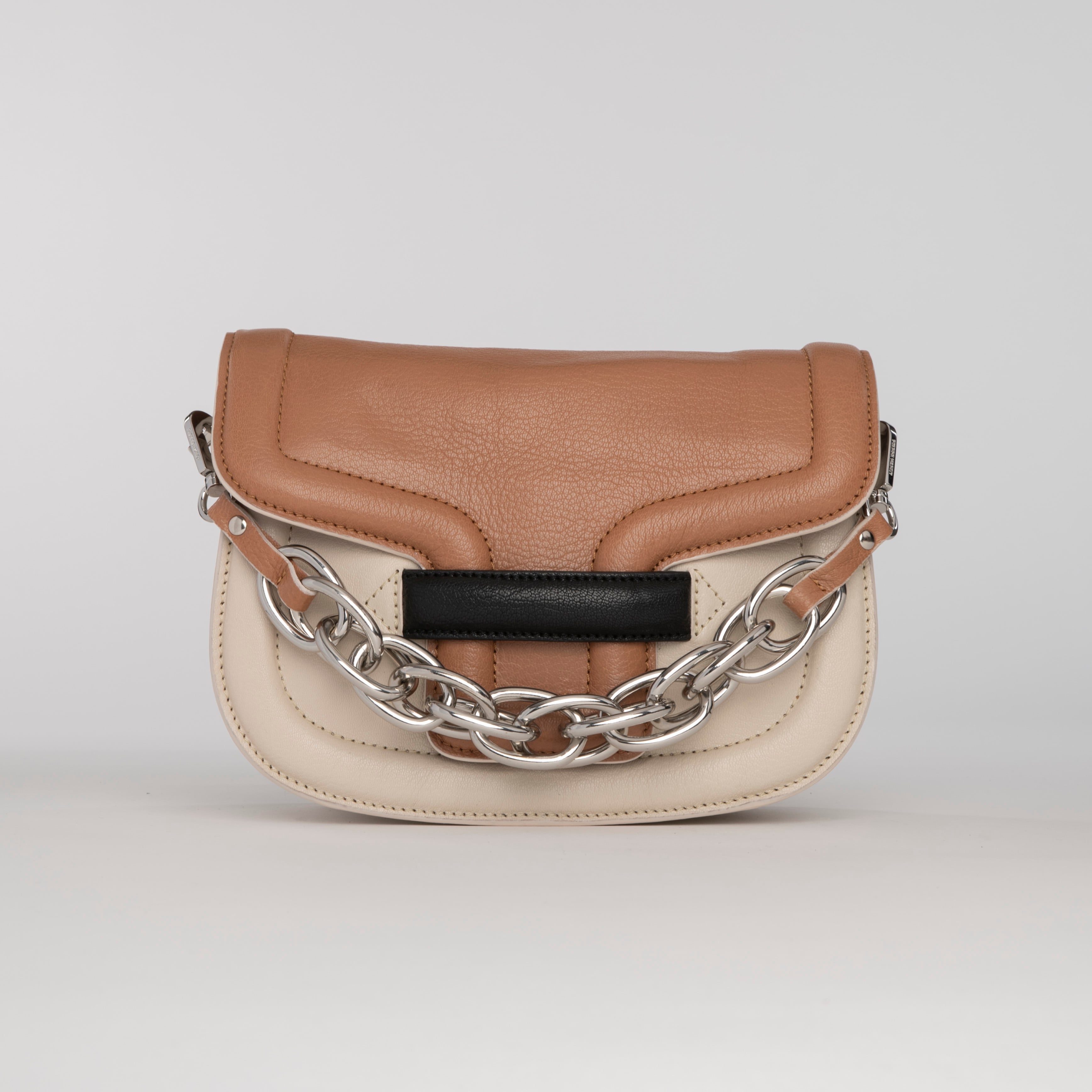 チャンキーなチェーンハンドルが付属した2つの表情を楽しめるハンドバッグ。