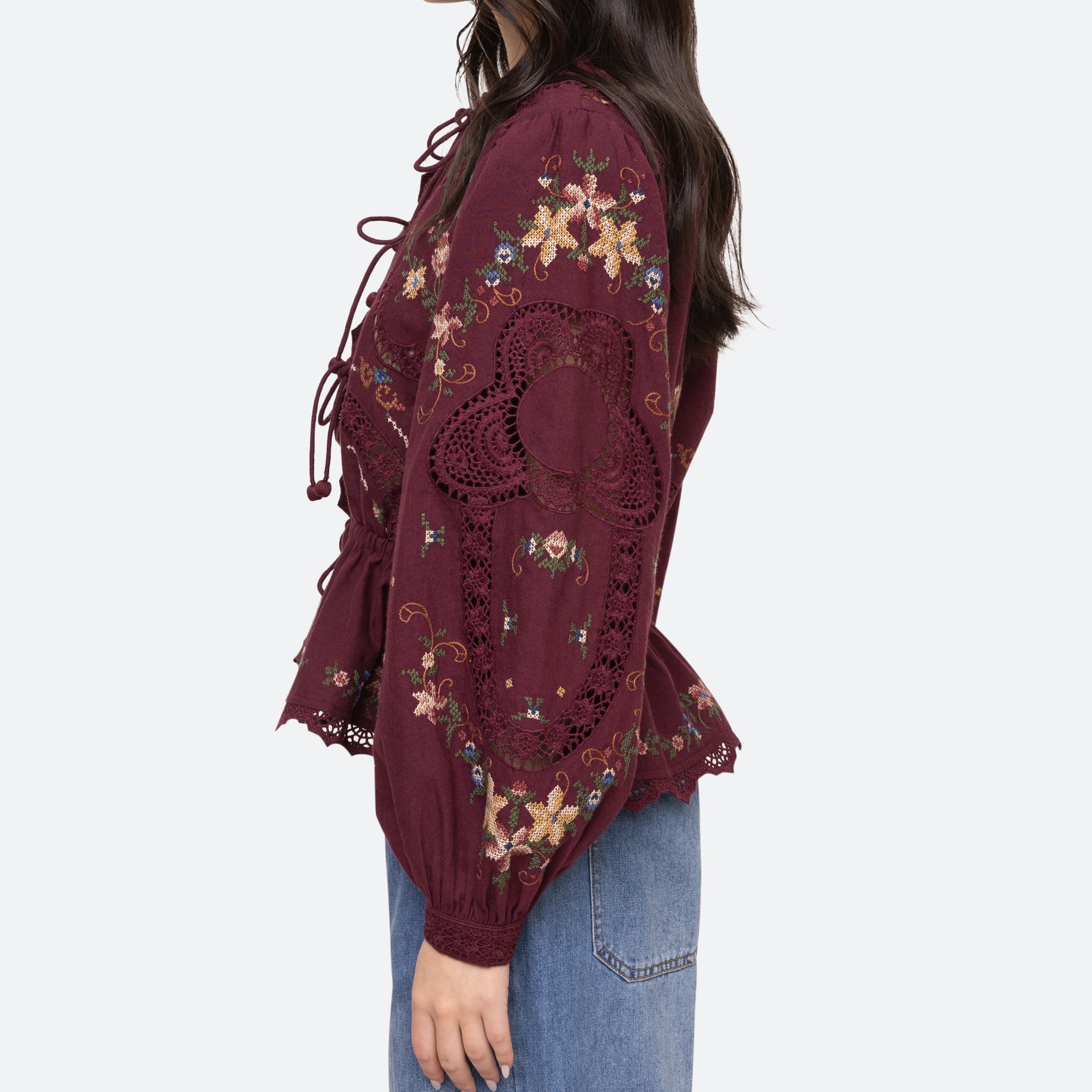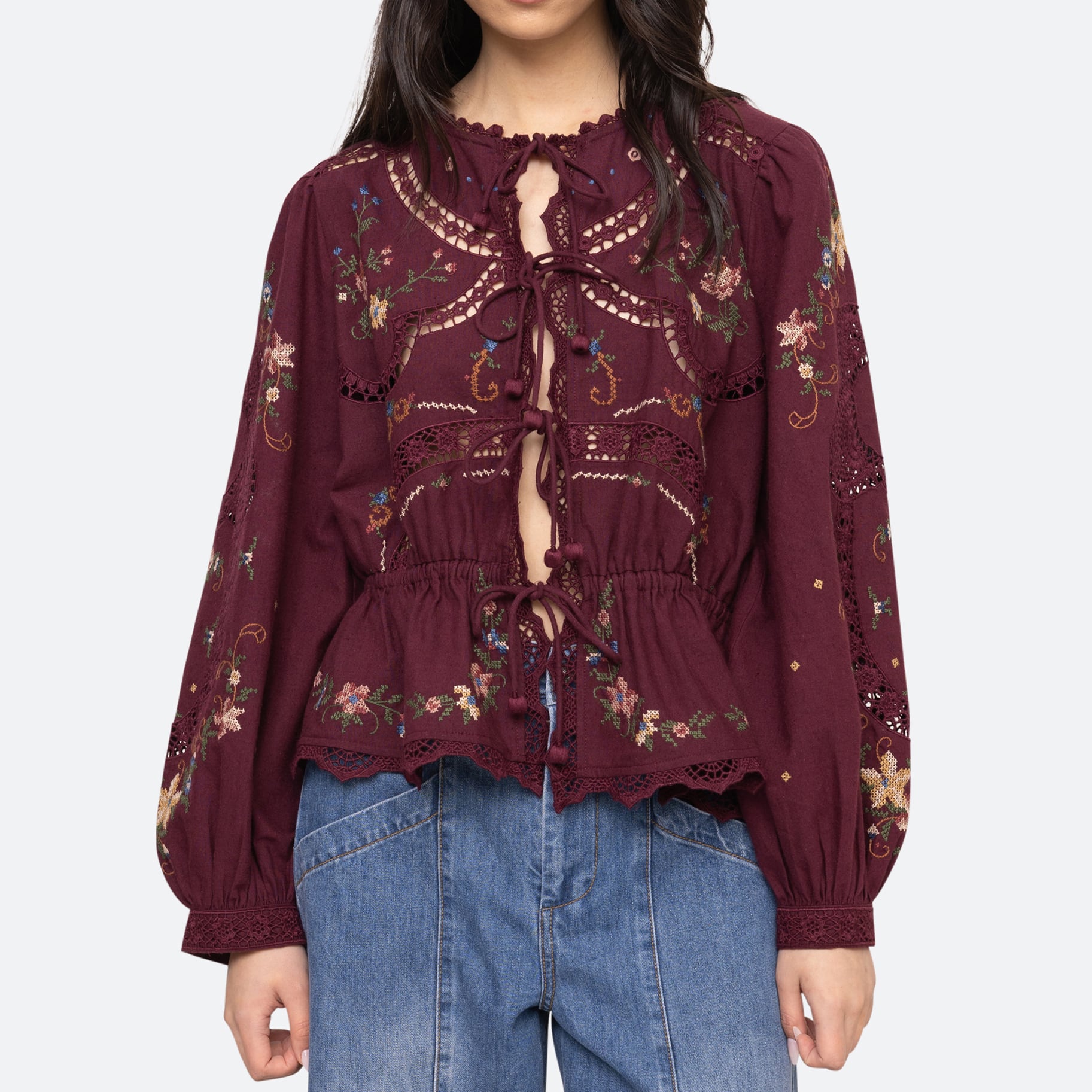 SEA NY EDWINA EMBROIDALY L/SLV TIE FRONT TOP BURGUNDY