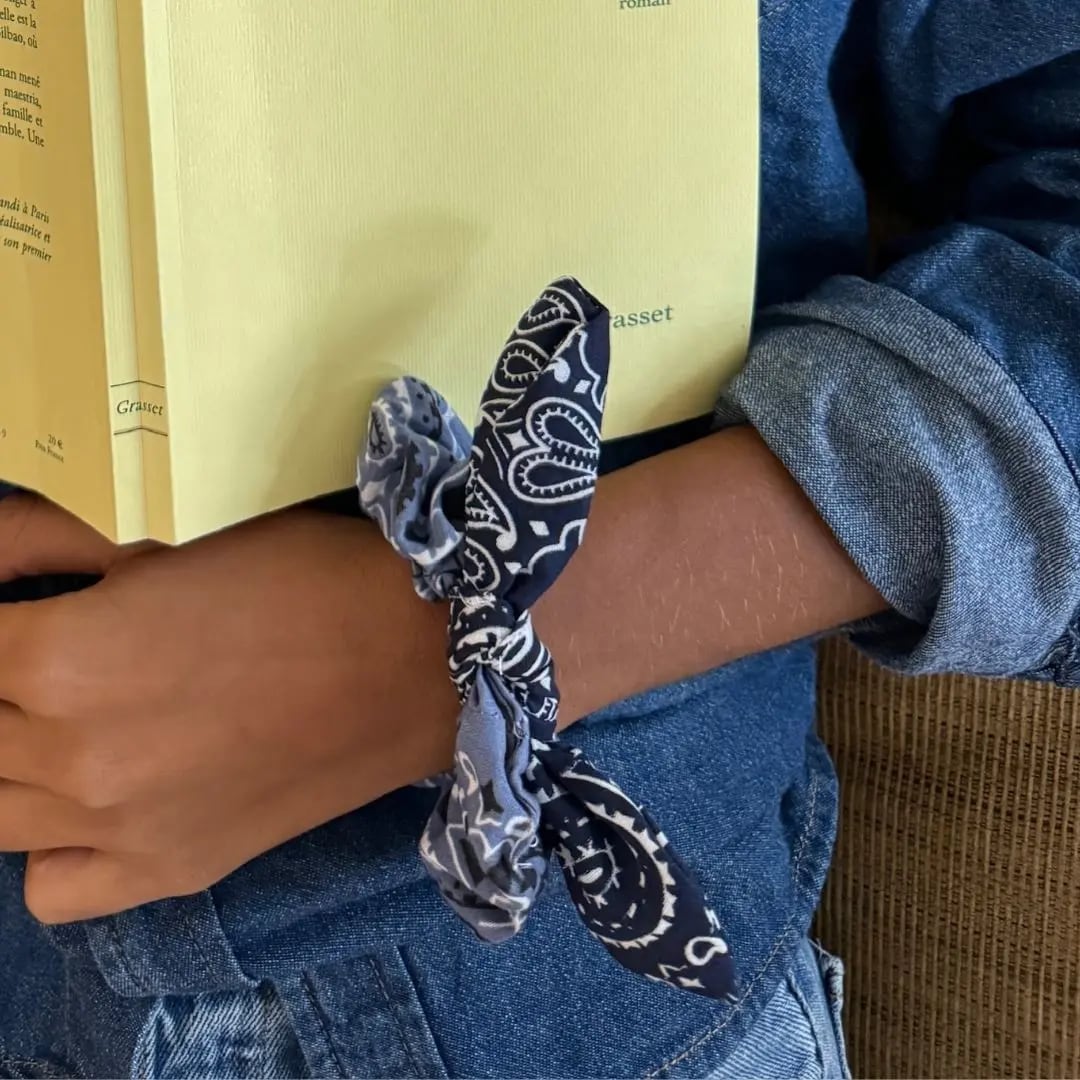 バンダナ生地のシュシュはヘアアクセやブレスレットにしたり、アレンジをお楽しみください