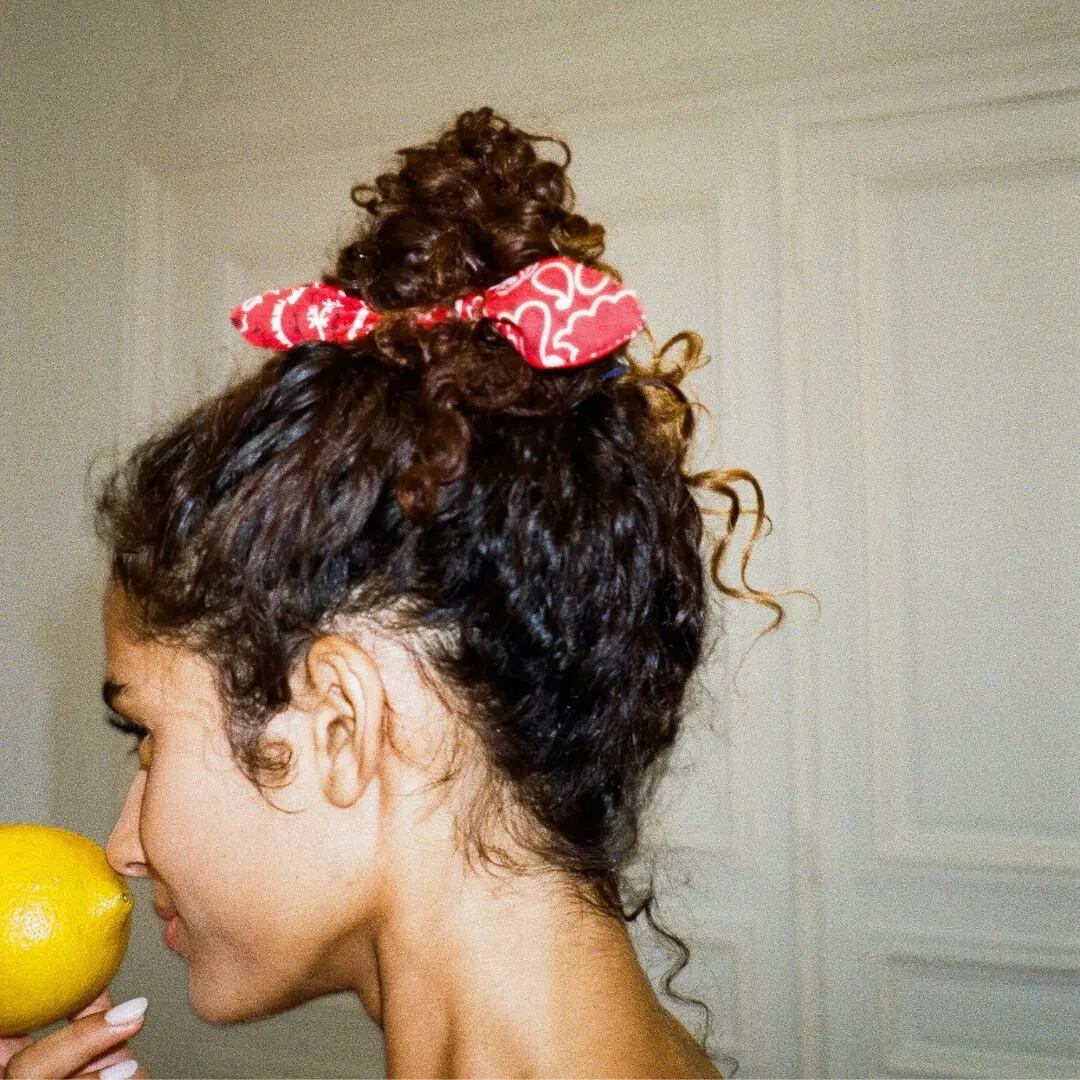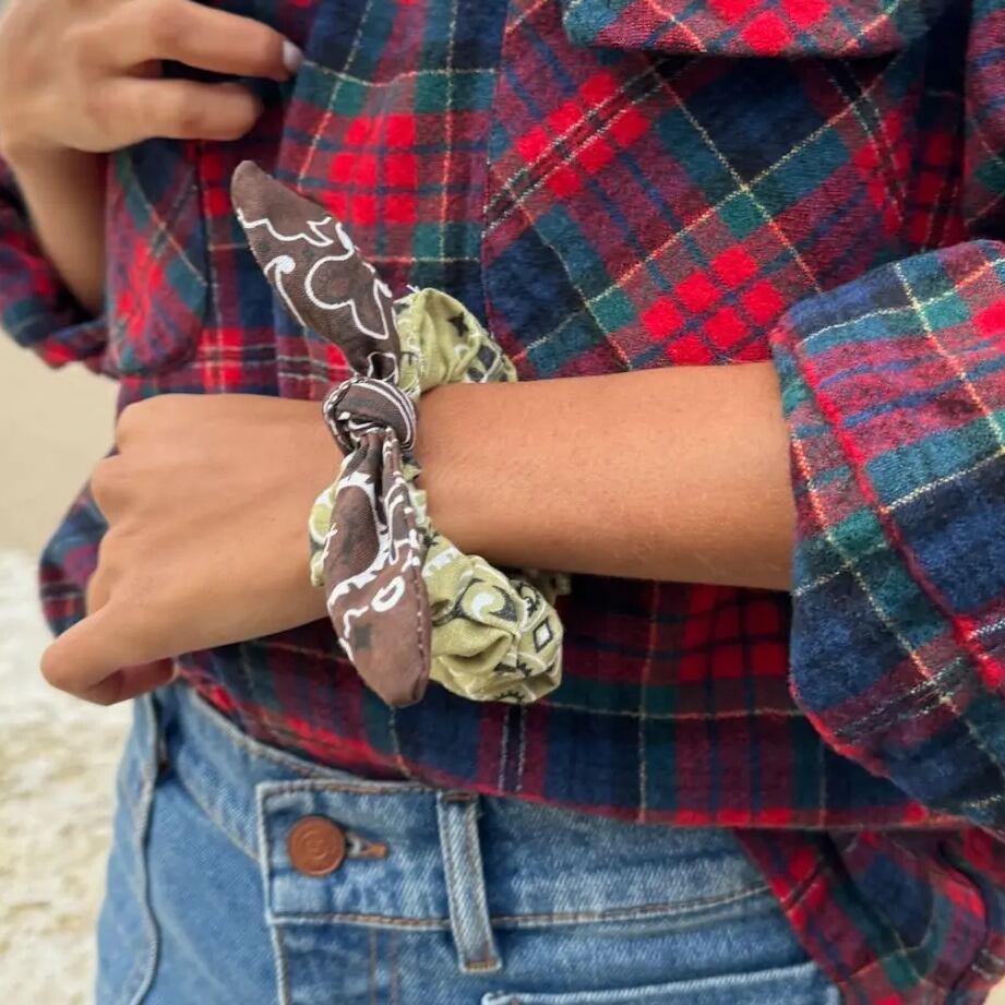 バンダナ生地のシュシュはヘアアクセやブレスレットにしたり、アレンジをお楽しみください
